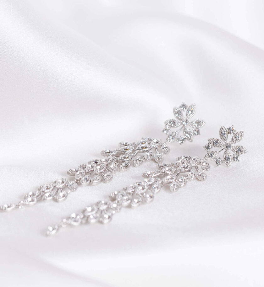 Realize your full opulence with these gorgeous long earrings. Set in a near three-dimensional fashion, these small diamond-clear crystals are feathered in a manner that is sure to stun. Silver setting.